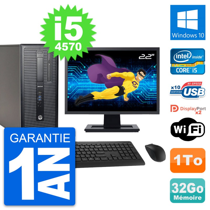 PC Tour HP 800 G1 Ecran 22" Intel i5-4570 RAM 32Go Disque 1To Windows 10 Wifi