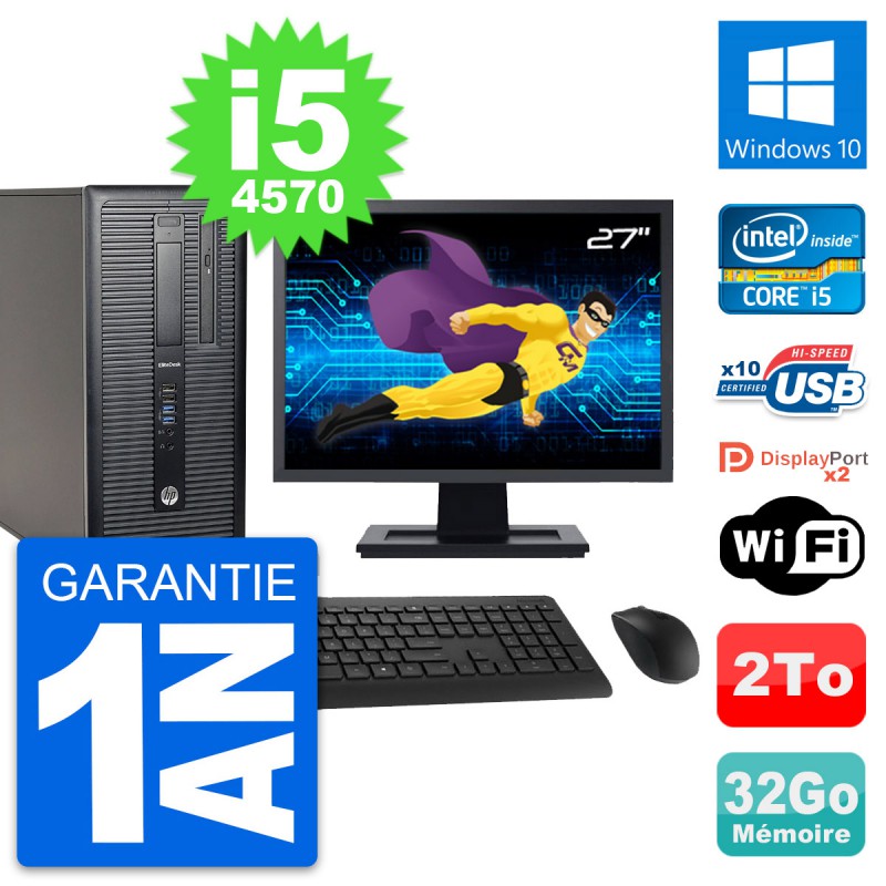PC Tour HP EliteDesk 800 G1 - Intel Core i5-4570 3.2 Ghz (6 Mo) - 32 Go DDR3 - Disque Dur 3,5" 2 To - Graveur DVD - Clef Wifi USB - Windows 10 - Livré avec Ecran 27" + clavier + souris (Marques et modèles variables) - Garantie 1 an.