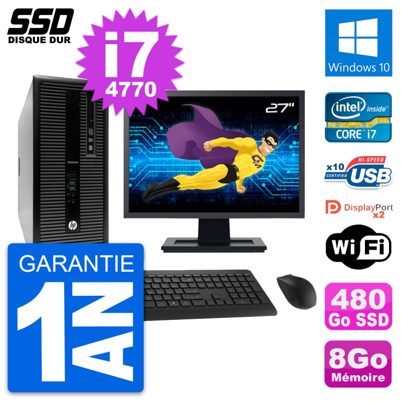 PC Tour HP EliteDesk 800 G1 - Intel Core i7-4770 3.4 Ghz (8 Mo) - 8 Go DDR3 - Disque Dur SSD 480 Go - Graveur DVD - Clef Wifi USB - Windows 10 - Livré avec Ecran 27" + clavier + souris (Marques et modèles variables) - Garantie 1 an.