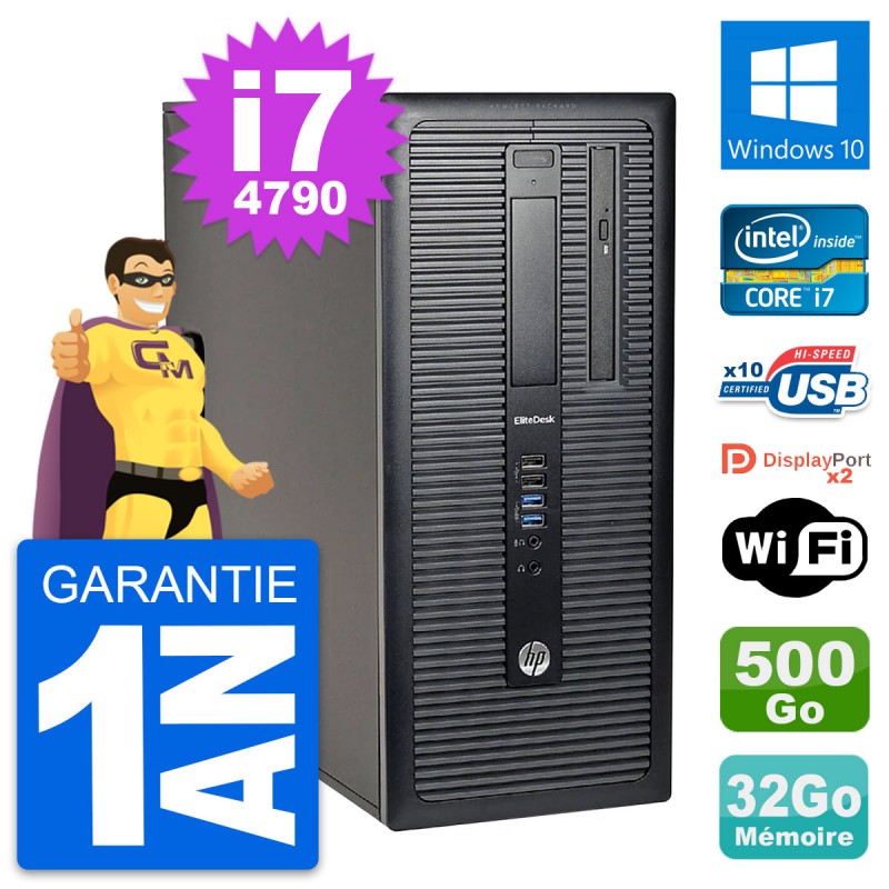 PC Tour HP EliteDesk 800 G1 - Intel Core i7-4790 3.6 Ghz (8 Mo) - 32 Go DDR3 - Disque Dur 3,5" 500 Go - Graveur DVD - Clef Wifi USB - Windows 10 - Garantie 1 an.