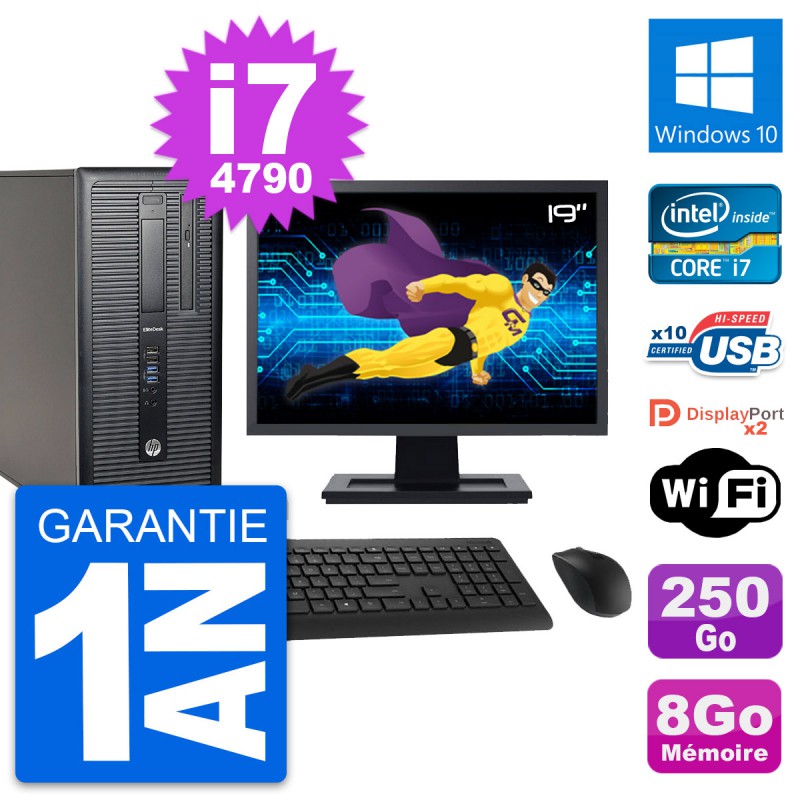 PC Tour HP 800 G1 Ecran 19" Intel i7-4790 RAM 8Go Disque 250Go Windows 10 Wifi