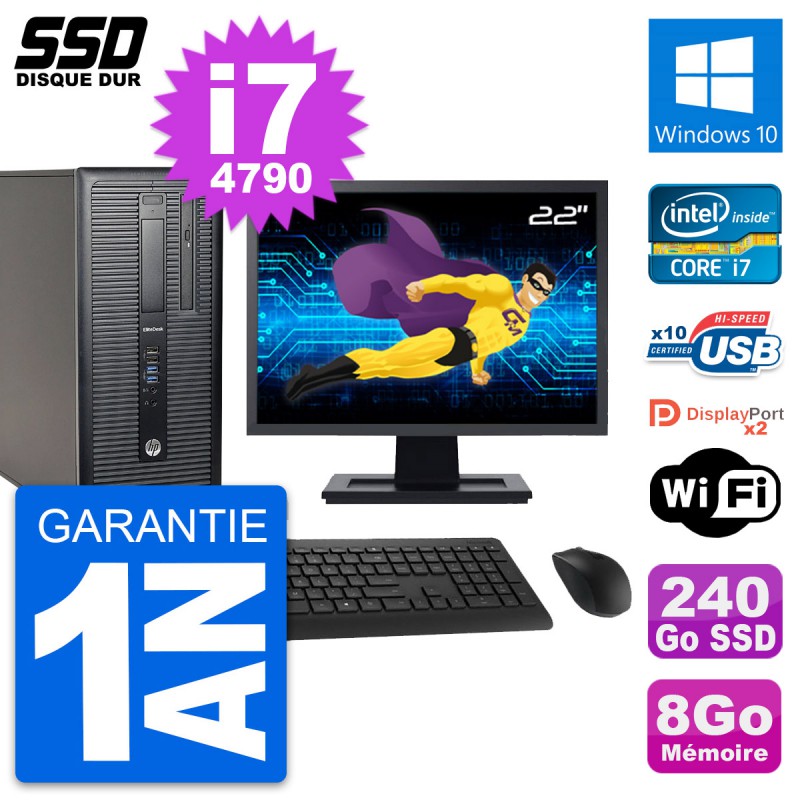 PC Tour HP EliteDesk 800 G1 Ecran 22" i7-4790 RAM 8Go SSD 240Go Windows 10 Wifi