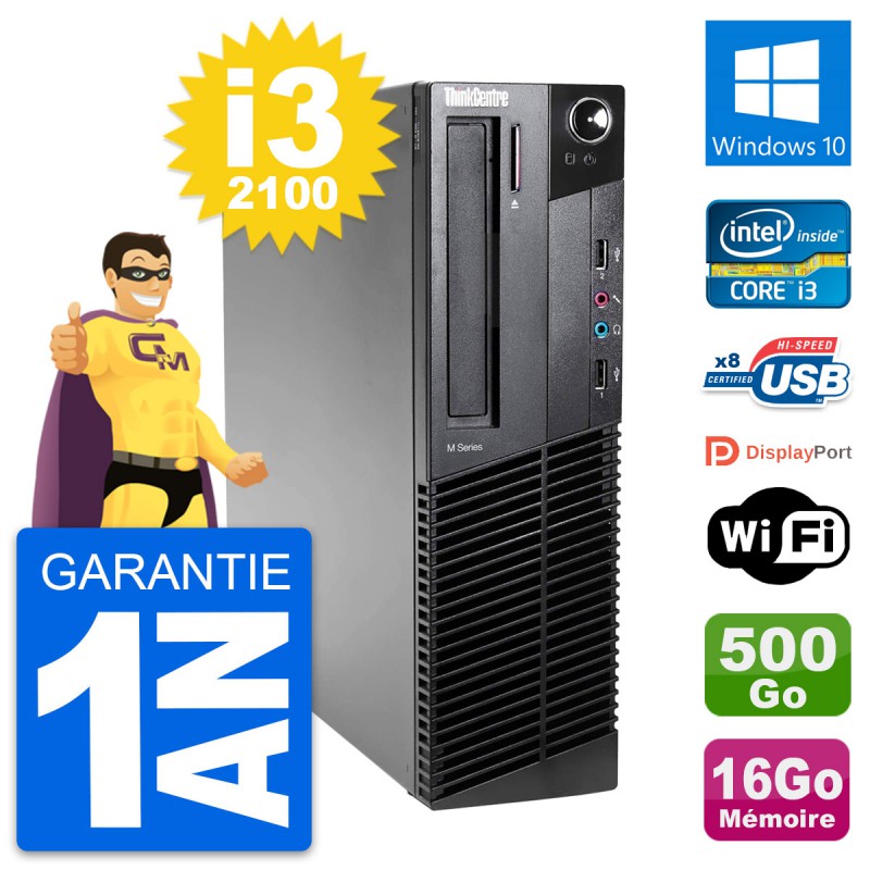 PC Lenovo ThinkCentre M82 SFF Core i3-2100 RAM 16Go Disque 500Go Windows 10 Wifi