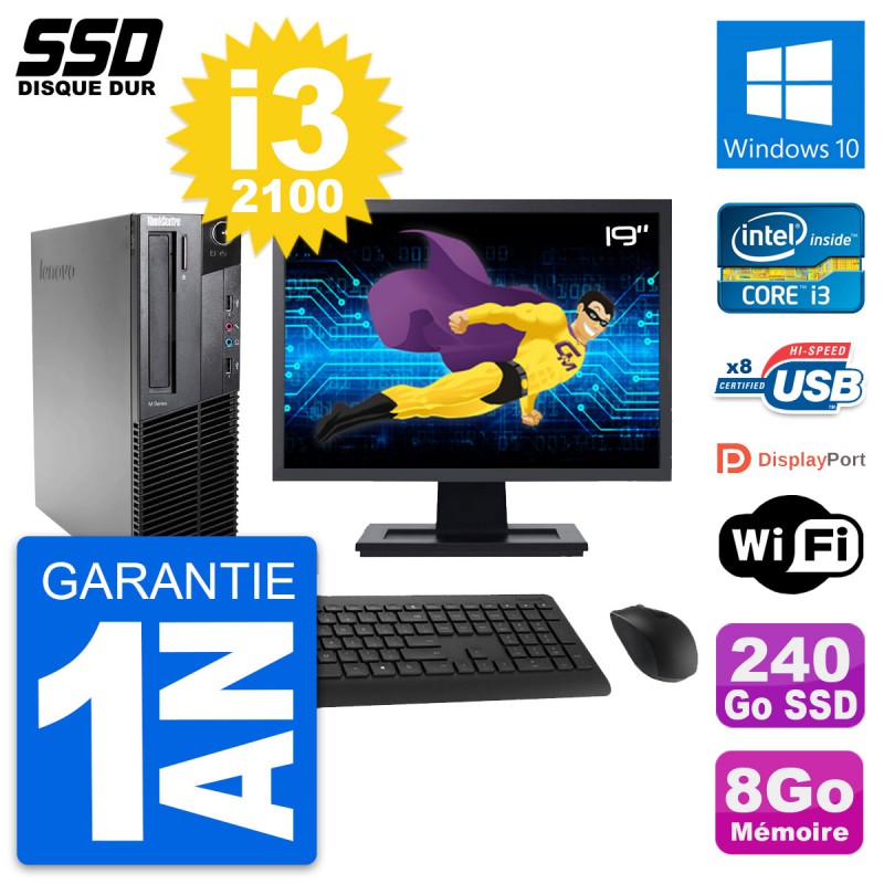 PC Lenovo M82 SFF - Intel Core i3-2100 3.1 Ghz (3 Mo) - 8 Go DDR3 - Disque Dur SSD 240 Go - Graveur DVD - Clef Wifi USB - Windows 10 - Livré avec Ecran 19" + clavier + souris (Marques et modèles variables) - Garantie 1 an.