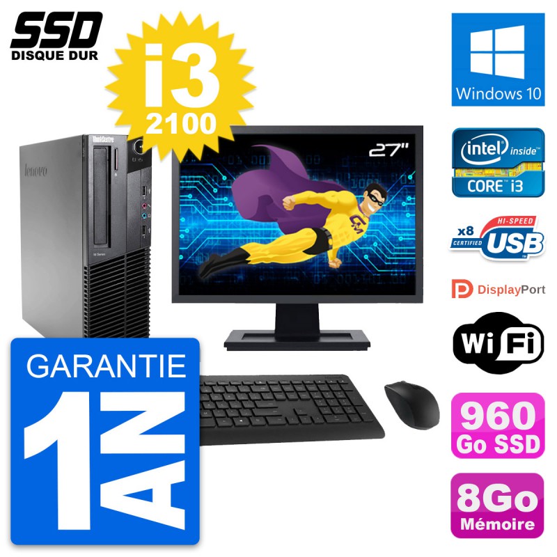 PC Lenovo M82 SFF - Intel Core i3-2100 3.1 Ghz (3 Mo) - 8 Go DDR3 - Disque Dur SSD 960 Go - Graveur DVD - Clef Wifi USB - Windows 10 - Livré avec Ecran 27" + clavier + souris (Marques et modèles variables) - Garantie 1 an.