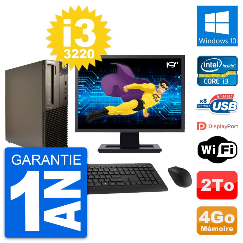 PC Lenovo M82 SFF - Intel Core i3-3220 3.3 Ghz (3 Mo) - 4 Go DDR3 - Disque Dur 3,5" 2 To - Graveur DVD - Clef Wifi USB - Windows 10 - Livré avec Ecran 19" + clavier + souris (Marques et modèles variables) - Garantie 1 an.