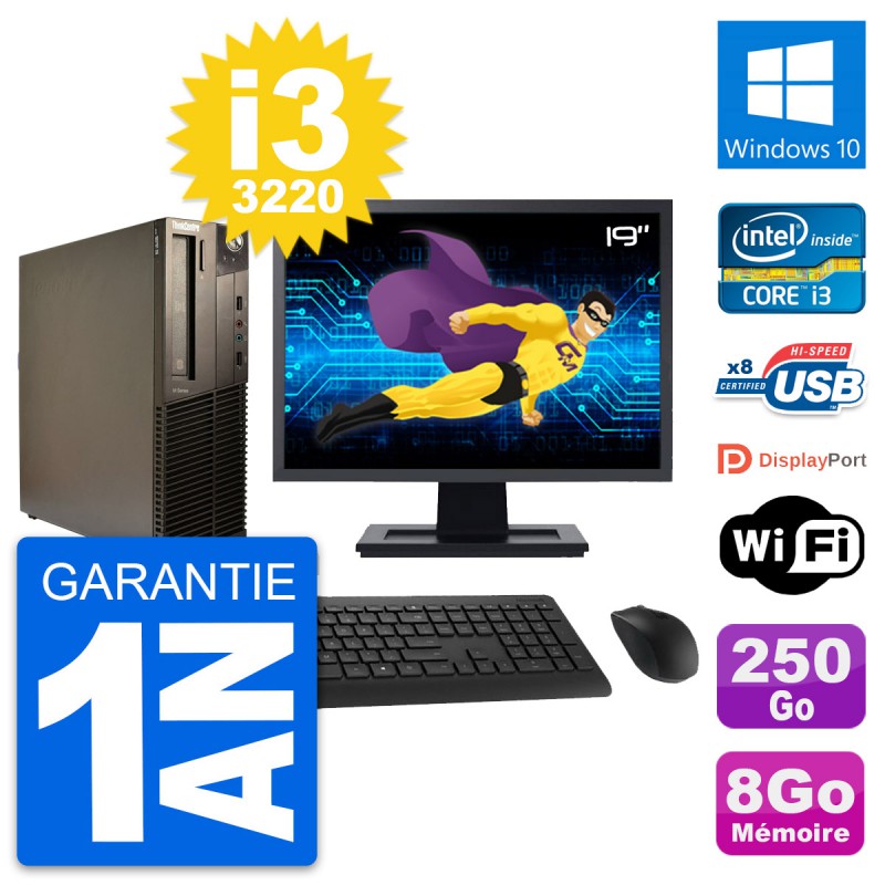 PC Lenovo M82 SFF - Intel Core i3-3220 3.3 Ghz (3 Mo) - 8 Go DDR3 - Disque Dur 3,5" 250 Go - Graveur DVD - Clef Wifi USB - Windows 10 - Livré avec Ecran 19" + clavier + souris (Marques et modèles variables) - Garantie 1 an.