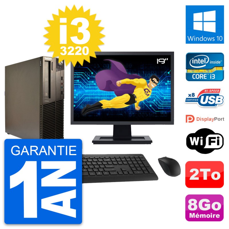 PC Lenovo M82 SFF - Intel Core i3-3220 3.3 Ghz (3 Mo) - 8 Go DDR3 - Disque Dur 3,5" 2 To - Graveur DVD - Clef Wifi USB - Windows 10 - Livré avec Ecran 19" + clavier + souris (Marques et modèles variables) - Garantie 1 an.