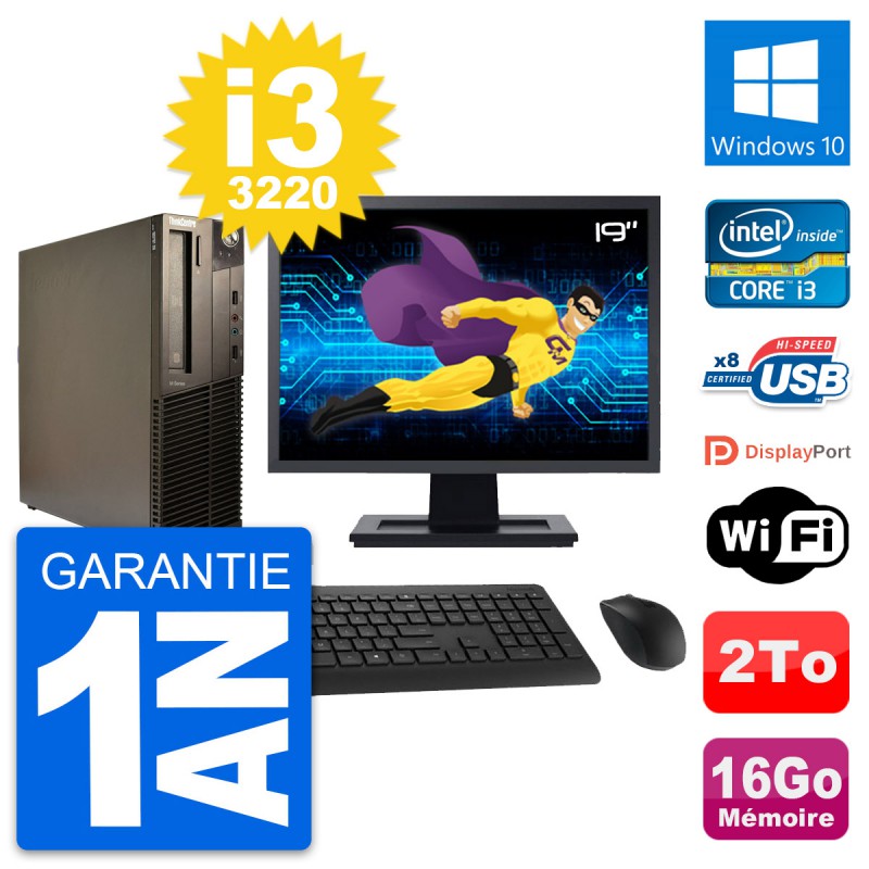 PC Lenovo M82 SFF - Intel Core i3-3220 3.3 Ghz (3 Mo) - 16 Go DDR3 - Disque Dur 3,5" 2 To - Graveur DVD - Clef Wifi USB - Windows 10 - Livré avec Ecran 19" + clavier + souris (Marques et modèles variables) - Garantie 1 an.
