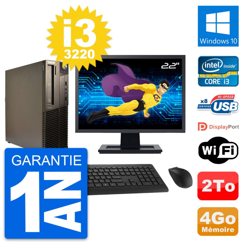 PC Lenovo M82 SFF - Intel Core i3-3220 3.3 Ghz (3 Mo) - 4 Go DDR3 - Disque Dur 3,5" 2 To - Graveur DVD - Clef Wifi USB - Windows 10 - Livré avec Ecran 22" + clavier + souris (Marques et modèles variables) - Garantie 1 an.