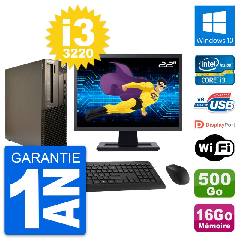 PC Lenovo M82 SFF - Intel Core i3-3220 3.3 Ghz (3 Mo) - 16 Go DDR3 - Disque Dur 3,5" 500 Go - Graveur DVD - Clef Wifi USB - Windows 10 - Livré avec Ecran 22" + clavier + souris (Marques et modèles variables) - Garantie 1 an.