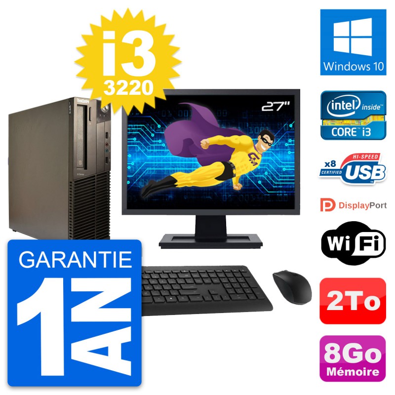 PC Lenovo M82 SFF - Intel Core i3-3220 3.3 Ghz (3 Mo) - 8 Go DDR3 - Disque Dur 3,5" 2 To - Graveur DVD - Clef Wifi USB - Windows 10 - Livré avec Ecran 27" + clavier + souris (Marques et modèles variables) - Garantie 1 an.