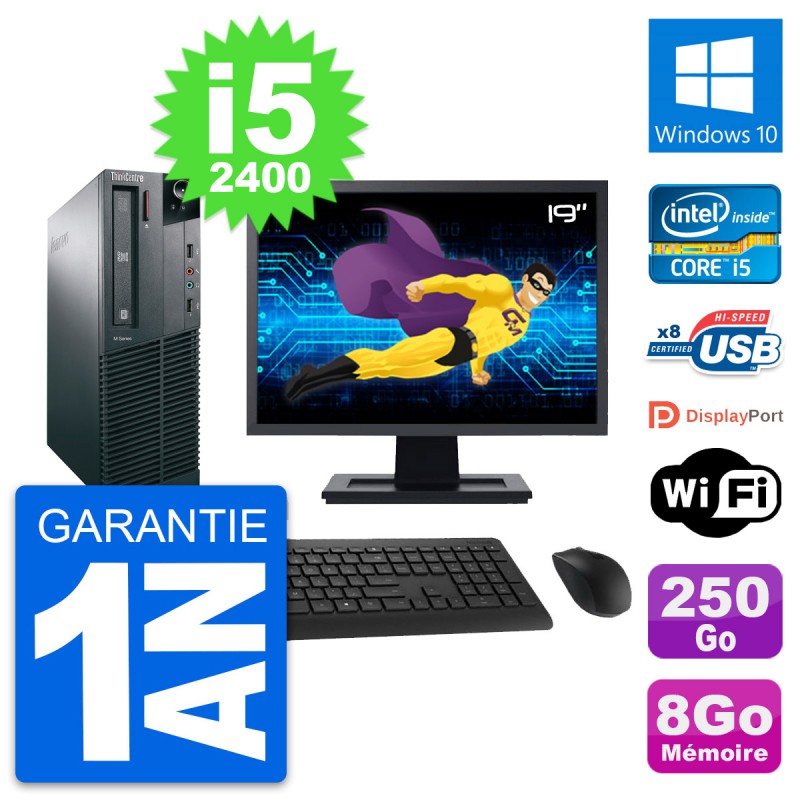 PC Lenovo M82 SFF - Intel Core i5-2400 3.1 Ghz (6 Mo) - 8 Go DDR3 - Disque Dur 3,5" 250 Go - Graveur DVD - Clef Wifi USB - Windows 10 - Livré avec Ecran 19" + clavier + souris (Marques et modèles variables) - Garantie 1 an.