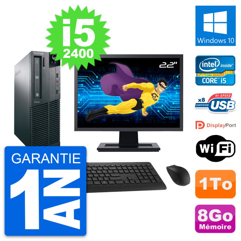 PC Lenovo M82 SFF - Intel Core i5-2400 3.1 Ghz (6 Mo) - 8 Go DDR3 - Disque Dur 3,5" 1 To - Graveur DVD - Clef Wifi USB - Windows 10 - Livré avec Ecran 22" + clavier + souris (Marques et modèles variables) - Garantie 1 an.