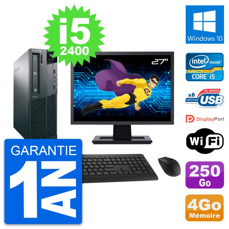 PC Lenovo M82 SFF - Intel Core i5-2400 3.1 Ghz (6 Mo) - 4 Go DDR3 - Disque Dur 3,5" 250 Go - Graveur DVD - Clef Wifi USB - Windows 10 - Livré avec Ecran 27" + clavier + souris (Marques et modèles variables) - Garantie 1 an.