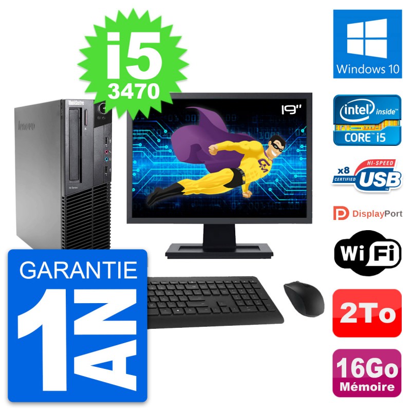 PC Lenovo M82 SFF - Intel Core i5-3470 3.2 Ghz (6 Mo) - 16 Go DDR3 - Disque Dur 3,5" 2 To - Graveur DVD - Clef Wifi USB - Windows 10 - Livré avec Ecran 19" + clavier + souris (Marques et modèles variables) - Garantie 1 an.