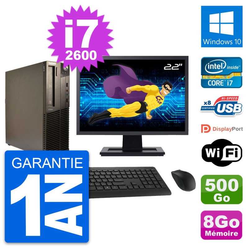 PC Lenovo M82 SFF - Intel Core i7-2600 3.4 Ghz (8 Mo) - 8 Go DDR3 - Disque Dur 3,5" 500 Go - Graveur DVD - Clef Wifi USB - Windows 10 - Livré avec Ecran 22" + clavier + souris (Marques et modèles variables) - Garantie 1 an.