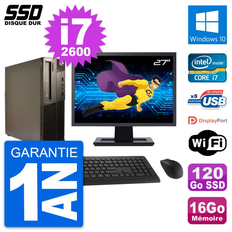 PC Lenovo M82 SFF - Intel Core i7-2600 3.4 Ghz (8 Mo) - 16 Go DDR3 - Disque Dur SSD 120 Go - Graveur DVD - Clef Wifi USB - Windows 10 - Livré avec Ecran 27" + clavier + souris (Marques et modèles variables) - Garantie 1 an.