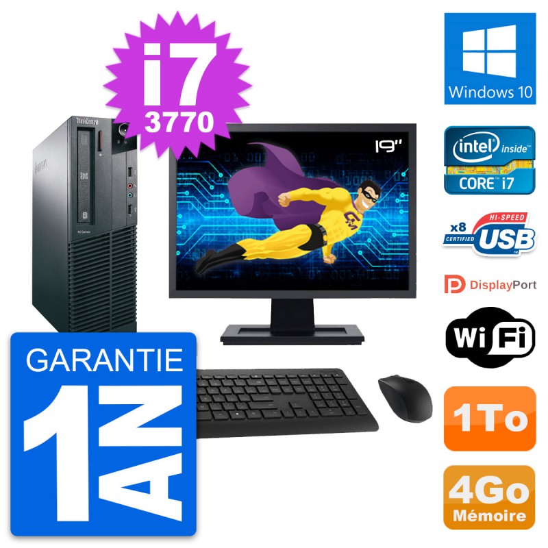 PC Lenovo M82 SFF - Intel Core i7-3770 3.4 Ghz (8 Mo) - 4 Go DDR3 - Disque Dur 3,5" 1 To - Graveur DVD - Clef Wifi USB - Windows 10 - Livré avec Ecran 19" + clavier + souris (Marques et modèles variables) - Garantie 1 an.