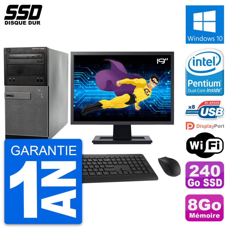 PC Tour Dell 3020 SFF - Intel Pentium G3220 3.0 Ghz (3 Mo) - 8 Go DDR3 - Disque Dur SSD 240 Go - Graveur DVD - Clef Wifi USB - Windows 10 - Livré avec Ecran 19" + clavier + souris (Marques et modèles variables) - Garantie 1 an.