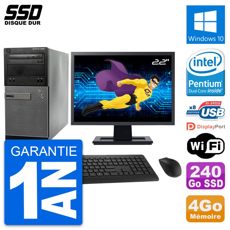 PC Tour Dell 3020 SFF - Intel Pentium G3220 3.0 Ghz (3 Mo) - 4 Go DDR3 - Disque Dur SSD 240 Go - Graveur DVD - Clef Wifi USB - Windows 10 - Livré avec Ecran 22" + clavier + souris (Marques et modèles variables) - Garantie 1 an.