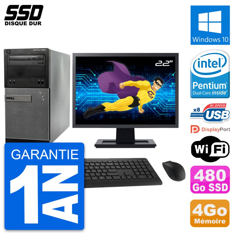 PC Tour Dell 3020 SFF - Intel Pentium G3220 3.0 Ghz (3 Mo) - 4 Go DDR3 - Disque Dur SSD 480 Go - Graveur DVD - Clef Wifi USB - Windows 10 - Livré avec Ecran 22" + clavier + souris (Marques et modèles variables) - Garantie 1 an.