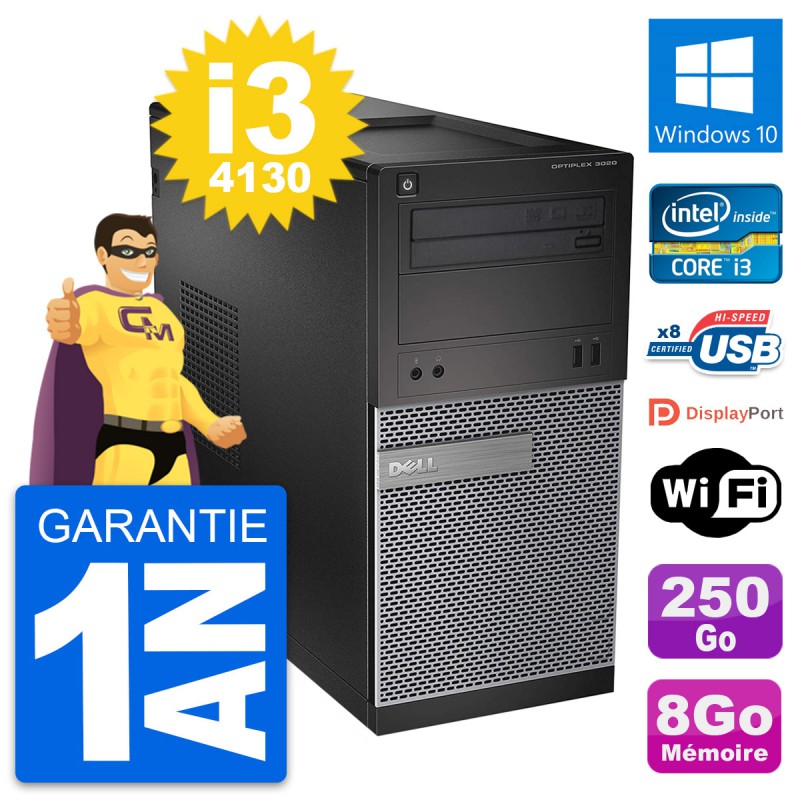 PC Tour Dell OptiPlex 3020 - Intel Core i3-4130 3.4 Ghz (3 Mo) - 8 Go DDR3 - Disque Dur 3,5" 250 Go - Graveur DVD - Clef Wifi USB - Windows 10 - Garantie 1 an.