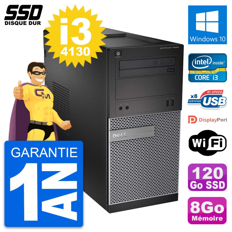 PC Tour Dell OptiPlex 3020 - Intel Core i3-4130 3.4 Ghz (3 Mo) - 8 Go DDR3 - Disque Dur SSD 120 Go - Graveur DVD - Clef Wifi USB - Windows 10 - Garantie 1 an.