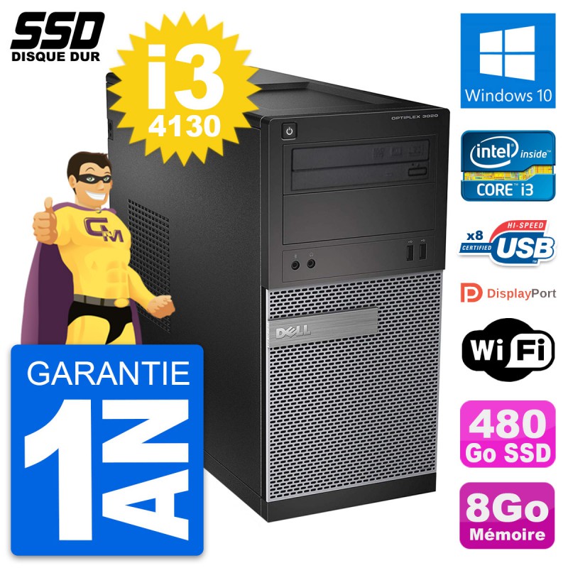 PC Tour Dell OptiPlex 3020 - Intel Core i3-4130 3.4 Ghz (3 Mo) - 8 Go DDR3 - Disque Dur SSD 480 Go - Graveur DVD - Clef Wifi USB - Windows 10 - Garantie 1 an.