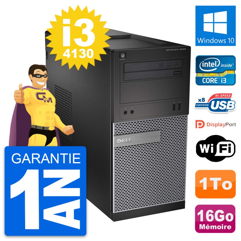 PC Tour Dell OptiPlex 3020 - Intel Core i3-4130 3.4 Ghz (3 Mo) - 16 Go DDR3 - Disque Dur 3,5" 1 To - Graveur DVD - Clef Wifi USB - Windows 10 - Garantie 1 an.