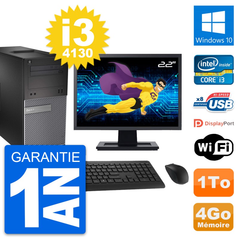 PC Tour Dell 3020 SFF - Intel Core i3-4130 3.4 Ghz (3 Mo) - 4 Go DDR3 - Disque Dur 3,5" 1 To - Graveur DVD - Clef Wifi USB - Windows 10 - Livré avec Ecran 22" + clavier + souris (Marques et modèles variables) - Garantie 1 an.