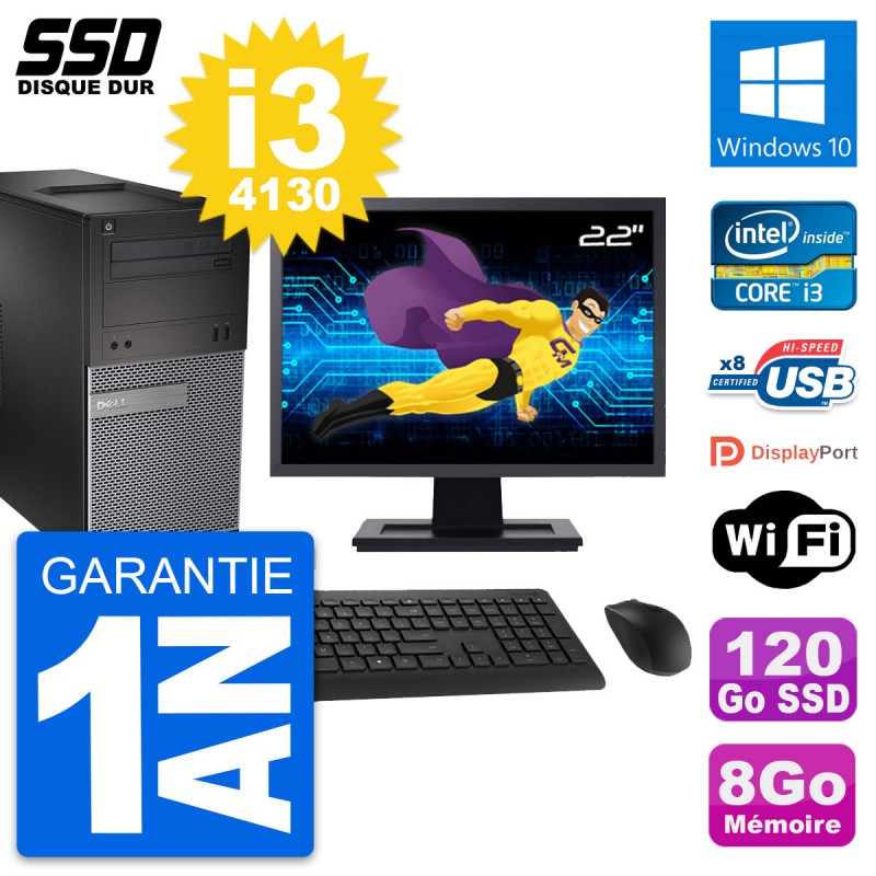 PC Tour Dell 3020 SFF - Intel Core i3-4130 3.4 Ghz (3 Mo) - 8 Go DDR3 - Disque Dur SSD 120 Go - Graveur DVD - Clef Wifi USB - Windows 10 - Livré avec Ecran 22" + clavier + souris (Marques et modèles variables) - Garantie 1 an.