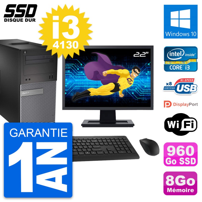 PC Tour Dell 3020 SFF - Intel Core i3-4130 3.4 Ghz (3 Mo) - 8 Go DDR3 - Disque Dur SSD 960 Go - Graveur DVD - Clef Wifi USB - Windows 10 - Livré avec Ecran 22" + clavier + souris (Marques et modèles variables) - Garantie 1 an.