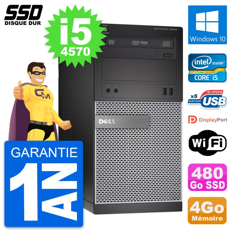 PC Tour Dell OptiPlex 3020 - Intel Core i5-4570 3.2 Ghz (6 Mo) - 4 Go DDR3 - Disque Dur SSD 480 Go - Graveur DVD - Clef Wifi USB - Windows 10 - Garantie 1 an.