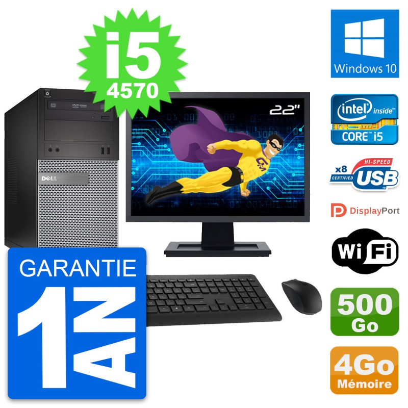 PC Tour Dell 3020 SFF - Intel Core i5-4570 3.2 Ghz (6 Mo) - 4 Go DDR3 - Disque Dur 3,5" 500 Go - Graveur DVD - Clef Wifi USB - Windows 10 - Livré avec Ecran 22" + clavier + souris (Marques et modèles variables) - Garantie 1 an.