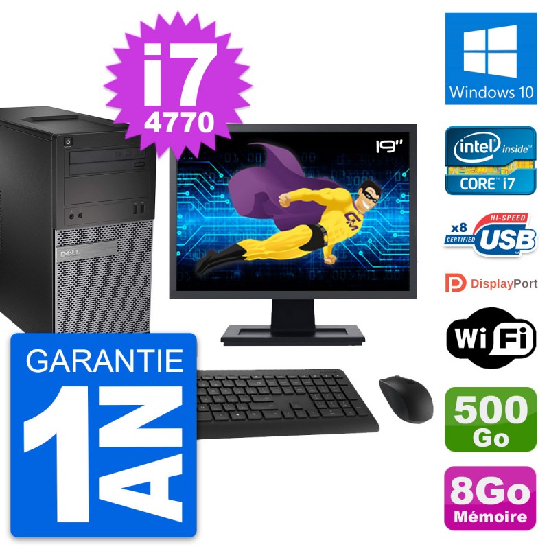 PC Tour Dell 3020 SFF - Intel Core i7-4770 3.4 Ghz (8 Mo) - 8 Go DDR3 - Disque Dur 3,5" 500 Go - Graveur DVD - Clef Wifi USB - Windows 10 - Livré avec Ecran 19" + clavier + souris (Marques et modèles variables) - Garantie 1 an.