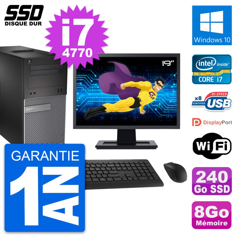 PC Tour Dell 3020 SFF - Intel Core i7-4770 3.4 Ghz (8 Mo) - 8 Go DDR3 - Disque Dur SSD 240 Go - Graveur DVD - Clef Wifi USB - Windows 10 - Livré avec Ecran 19" + clavier + souris (Marques et modèles variables) - Garantie 1 an.