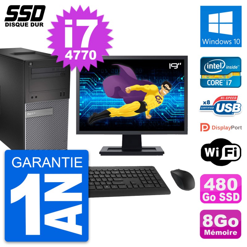 PC Tour Dell 3020 SFF - Intel Core i7-4770 3.4 Ghz (8 Mo) - 8 Go DDR3 - Disque Dur SSD 480 Go - Graveur DVD - Clef Wifi USB - Windows 10 - Livré avec Ecran 19" + clavier + souris (Marques et modèles variables) - Garantie 1 an.