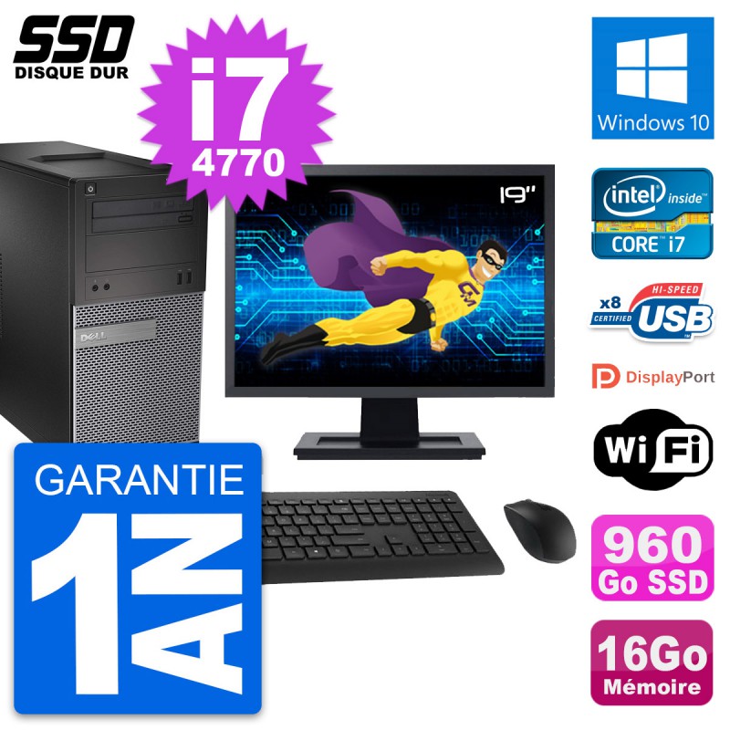 PC Tour Dell 3020 SFF - Intel Core i7-4770 3.4 Ghz (8 Mo) - 16 Go DDR3 - Disque Dur SSD 960 Go - Graveur DVD - Clef Wifi USB - Windows 10 - Livré avec Ecran 19" + clavier + souris (Marques et modèles variables) - Garantie 1 an.
