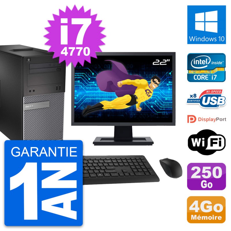 PC Tour Dell 3020 SFF - Intel Core i7-4770 3.4 Ghz (8 Mo) - 4 Go DDR3 - Disque Dur 3,5" 250 Go - Graveur DVD - Clef Wifi USB - Windows 10 - Livré avec Ecran 22" + clavier + souris (Marques et modèles variables) - Garantie 1 an.