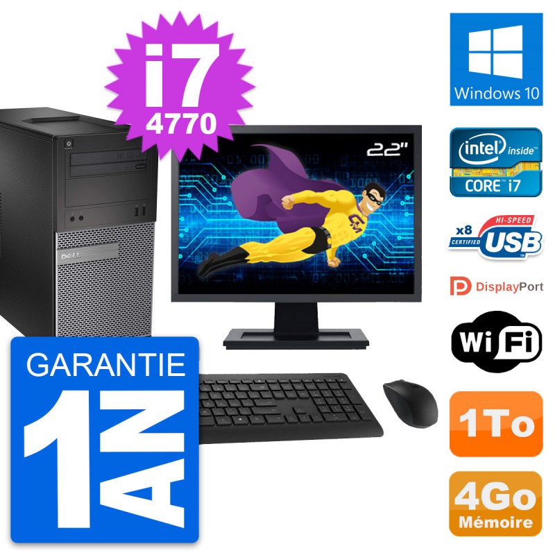 PC Tour Dell 3020 SFF - Intel Core i7-4770 3.4 Ghz (8 Mo) - 4 Go DDR3 - Disque Dur 3,5" 1 To - Graveur DVD - Clef Wifi USB - Windows 10 - Livré avec Ecran 22" + clavier + souris (Marques et modèles variables) - Garantie 1 an.
