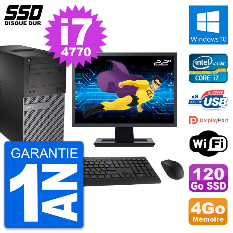 PC Tour Dell 3020 SFF - Intel Core i7-4770 3.4 Ghz (8 Mo) - 4 Go DDR3 - Disque Dur SSD 120 Go - Graveur DVD - Clef Wifi USB - Windows 10 - Livré avec Ecran 22" + clavier + souris (Marques et modèles variables) - Garantie 1 an.