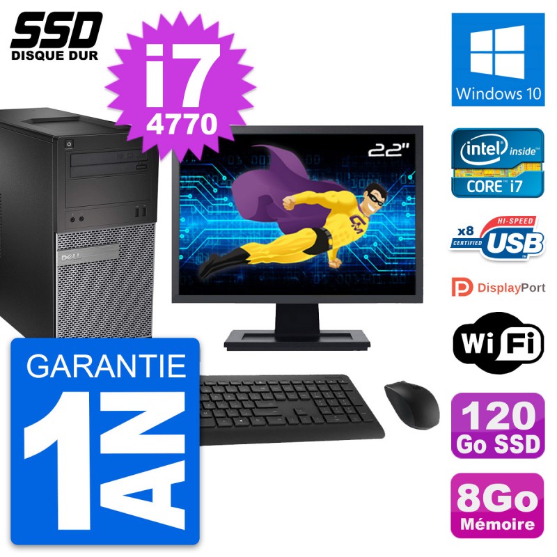 PC Tour Dell 3020 SFF - Intel Core i7-4770 3.4 Ghz (8 Mo) - 8 Go DDR3 - Disque Dur SSD 120 Go - Graveur DVD - Clef Wifi USB - Windows 10 - Livré avec Ecran 22" + clavier + souris (Marques et modèles variables) - Garantie 1 an.