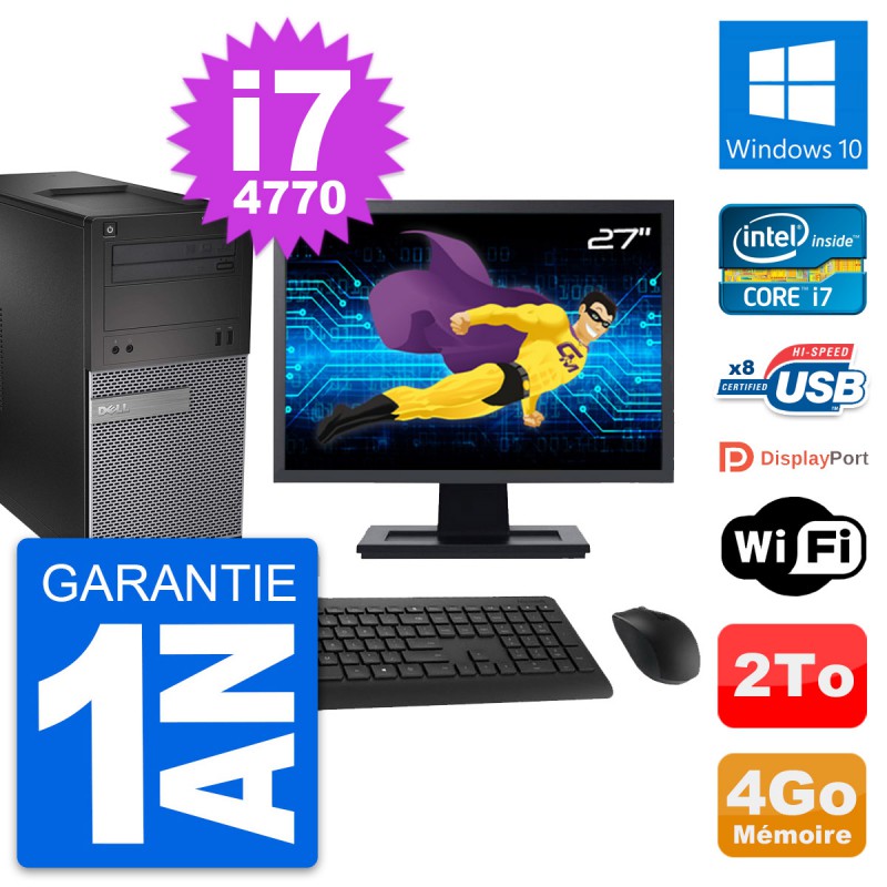 PC Tour Dell 3020 SFF - Intel Core i7-4770 3.4 Ghz (8 Mo) - 4 Go DDR3 - Disque Dur 3,5" 2 To - Graveur DVD - Clef Wifi USB - Windows 10 - Livré avec Ecran 27" + clavier + souris (Marques et modèles variables) - Garantie 1 an.