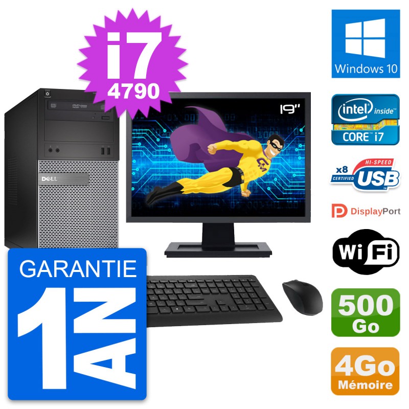 PC Tour Dell 3020 SFF - Intel Core i7-4790 3.6 Ghz (8 Mo) - 4 Go DDR3 - Disque Dur 3,5" 500 Go - Graveur DVD - Clef Wifi USB - Windows 10 - Livré avec Ecran 19" + clavier + souris (Marques et modèles variables) - Garantie 1 an.