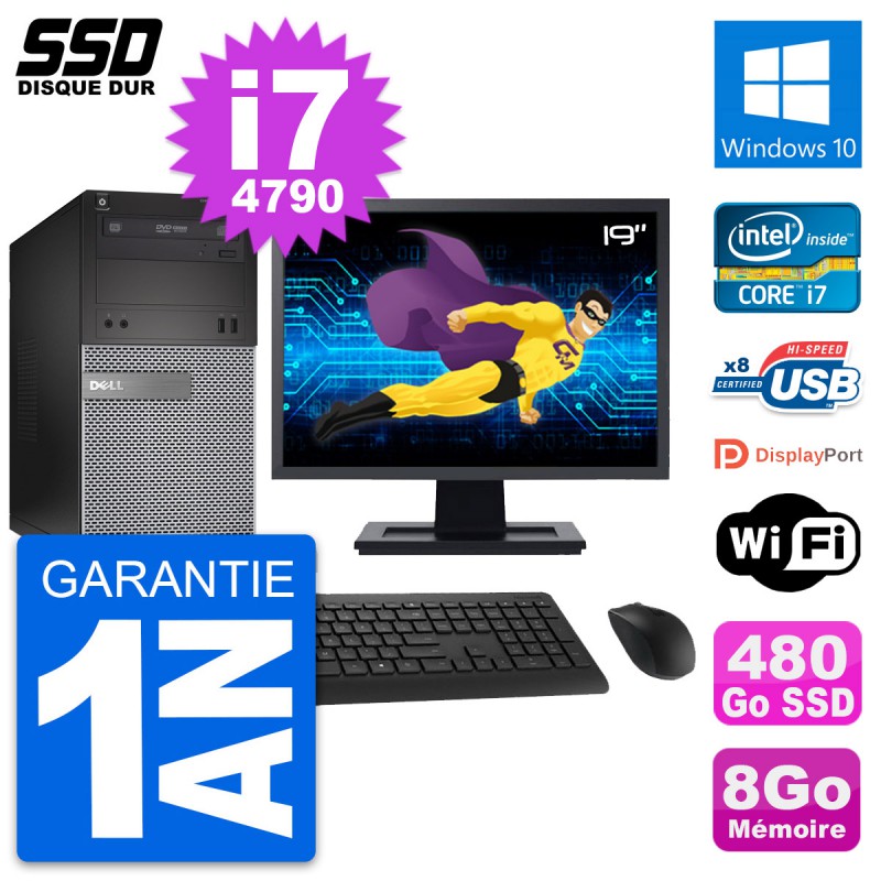 PC Tour Dell 3020 SFF - Intel Core i7-4790 3.6 Ghz (8 Mo) - 8 Go DDR3 - Disque Dur SSD 480 Go - Graveur DVD - Clef Wifi USB - Windows 10 - Livré avec Ecran 19" + clavier + souris (Marques et modèles variables) - Garantie 1 an.