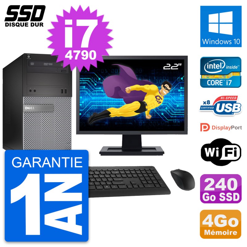 PC Tour Dell 3020 SFF - Intel Core i7-4790 3.6 Ghz (8 Mo) - 4 Go DDR3 - Disque Dur SSD 240 Go - Graveur DVD - Clef Wifi USB - Windows 10 - Livré avec Ecran 22" + clavier + souris (Marques et modèles variables) - Garantie 1 an.