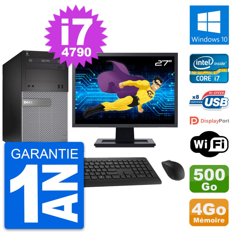 PC Tour Dell 3020 SFF - Intel Core i7-4790 3.6 Ghz (8 Mo) - 4 Go DDR3 - Disque Dur 3,5" 500 Go - Graveur DVD - Clef Wifi USB - Windows 10 - Livré avec Ecran 27" + clavier + souris (Marques et modèles variables) - Garantie 1 an.