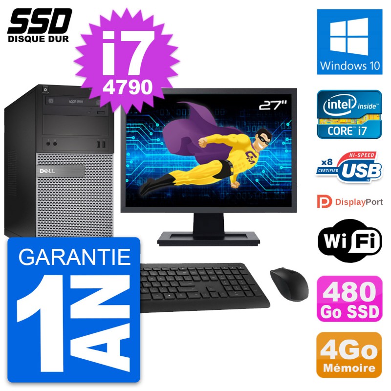 PC Tour Dell 3020 SFF - Intel Core i7-4790 3.6 Ghz (8 Mo) - 4 Go DDR3 - Disque Dur SSD 480 Go - Graveur DVD - Clef Wifi USB - Windows 10 - Livré avec Ecran 27" + clavier + souris (Marques et modèles variables) - Garantie 1 an.