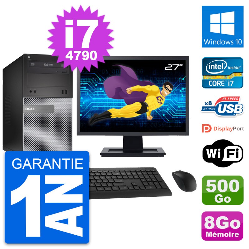 PC Tour Dell 3020 SFF - Intel Core i7-4790 3.6 Ghz (8 Mo) - 8 Go DDR3 - Disque Dur 3,5" 500 Go - Graveur DVD - Clef Wifi USB - Windows 10 - Livré avec Ecran 27" + clavier + souris (Marques et modèles variables) - Garantie 1 an.
